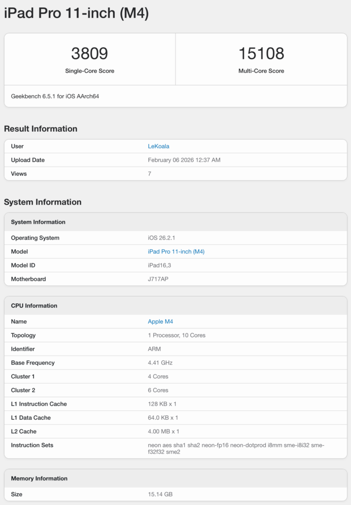 On passe ainsi d’un score simple coeur sous iPadOS 18.4 de 3665 points à 3809 points sous iPadOS 26.2.1, et d’un score multicoeurs de 14622 points sous iPadOS 18.4 à 15108 points multi-coeurs sous iPadOS 26.2.1.