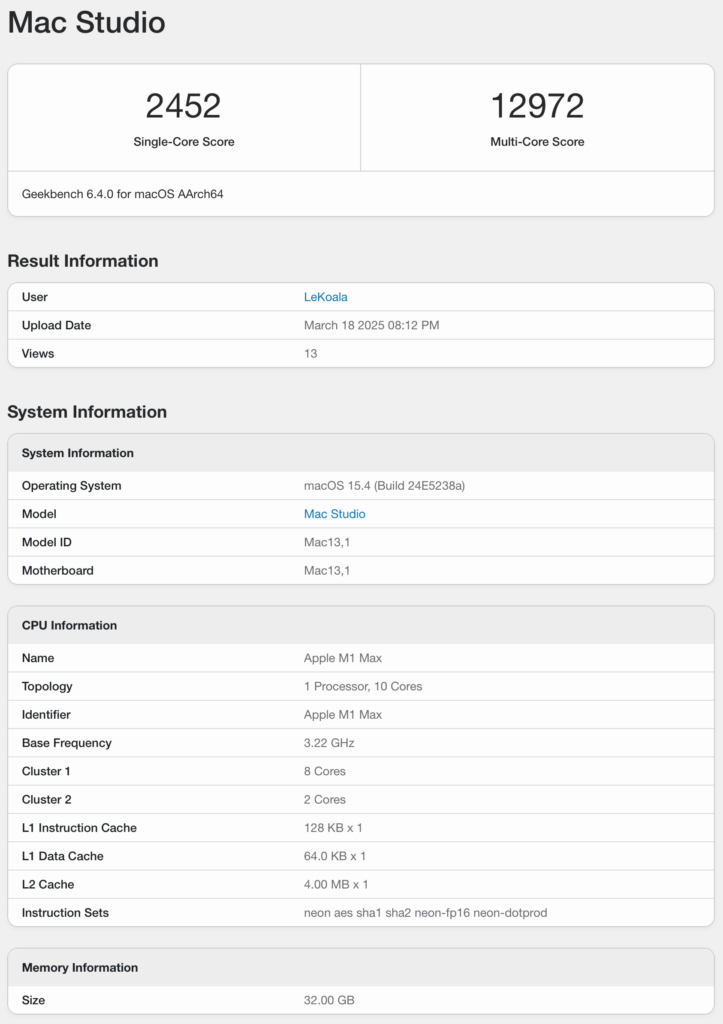 En effet, sous macOS 15.4 (Sequoia de son petit nom), mon Mac Studio M1 Max (entrée de gamme en 2022), m’affichait un score de 2452 points en simple coeur et de 12972 points en multi-coeurs.